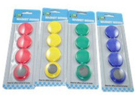 High quality ,strong magnets button, circles ,the cover is plastic , magnets colors assorted ,also package can be in box , blister cards ,or other package pattern .school supplies , home supplies , party supplies , you always can use magnets .