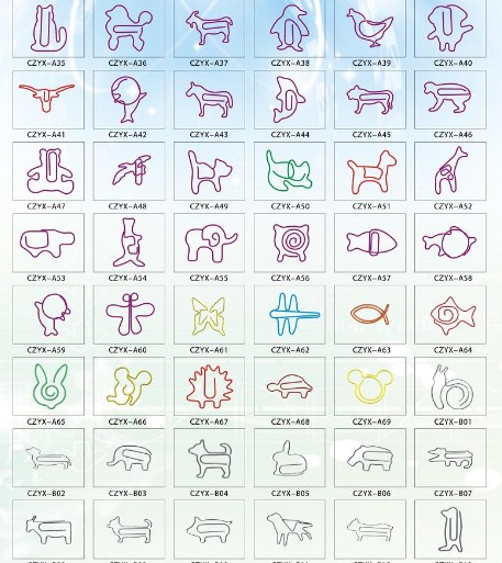 all kinds of animals shaped paper clips:dog shaped paper clip,horse shaped paper clips,butterfly shaped paper clips, goose shaped paper clips,elephant shaped paper clips, mouse shaped paper clips etc.